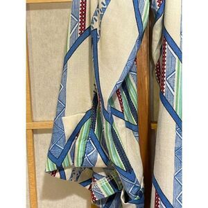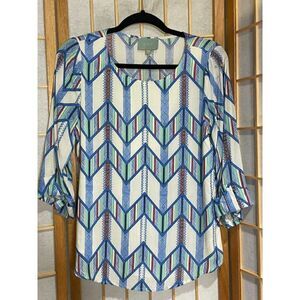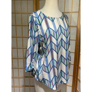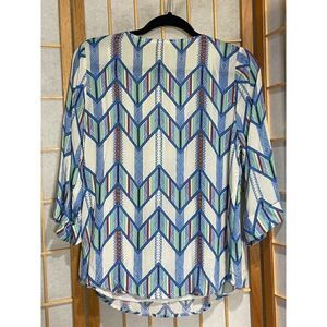 Beautiful light and airy, flowing blouse from Skies are Blue. Size large. Runs small, please check measurements. 3/4 sleeves. Hi/low hem. Style 34230DL. Geometric pattern. Roll cuff sleeves. Lined. Shell 100% rayon, lining 100% polyester. Hand wash. Made in China. Excellent condition. Nonsmoking home.
