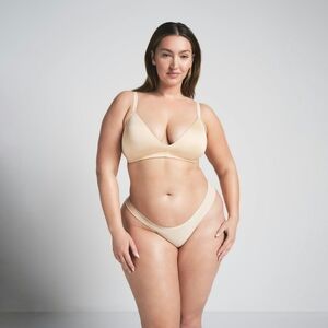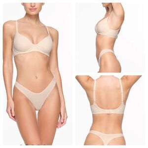 The t-shirt bra that started it all. This classic foundation with demi coverage has 360-stretch technology for a custom-made fit even when youre between sizes. Made of our signature buttery-soft fabric with a second-skin feel that makes you forget youre wearing a bra. Offers unparalleled support with its lightly lined cups and flexible underwire that doesnt dig. Features adjustable straps and a hook and eye closure in the back. Fits true to your SKIMS bra size.
