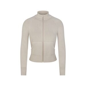 Up your off-duty game in this fitted track jacket with a sporty look and feel. Features a mock neck, full front zipper and two pockets as well as elastic cuffs, neck band, and bottom band. Fits true to size.