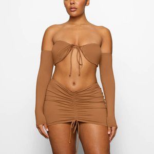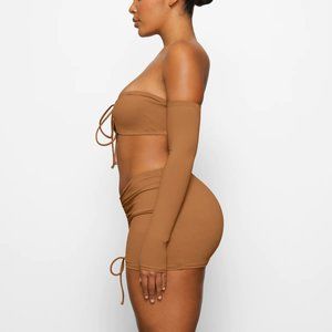 An off-the-shoulder Skims long-sleeve bikini top with a sweetheart neckline and silicone elastic to keep it all in place. Features an adjustable front tie. Bikini top is in an almond color that makes your skin glow.