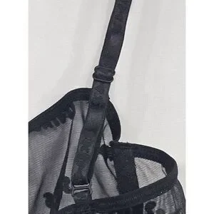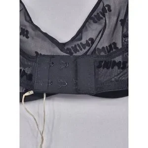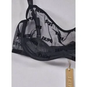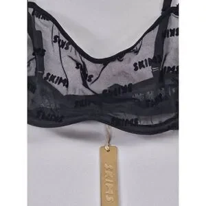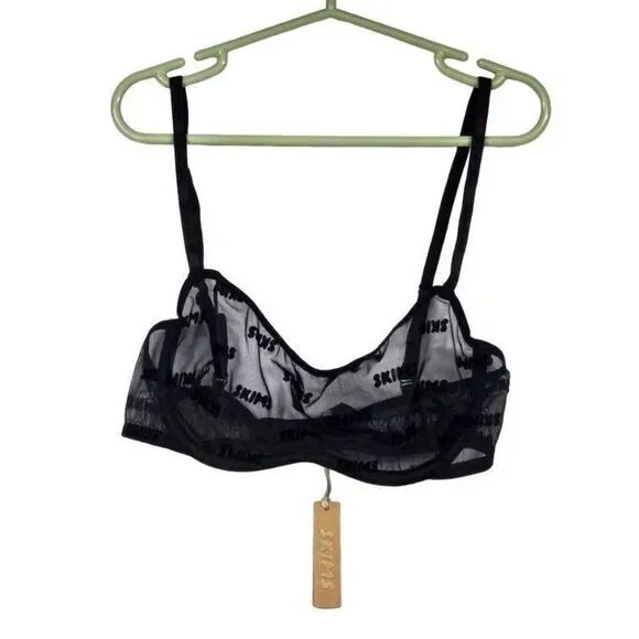 Pretty and feminine. Fine mesh bra is embellished with flocked skims logo all over. Underwire cups, fully adjustable straps and double hook and eye back closure. Fabric is 85% polymide, 15% elastane.