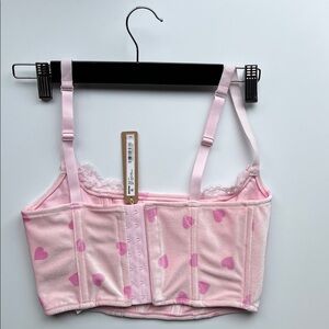 Features: The top is cropped and features fabric-lined boning for structure and lift, adjustable straps with dainty bow details, peek-a-boo lace trim, and a hook-and-eye closure at the back.