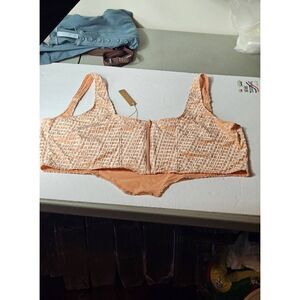 Peach color, size 3x. Logo flocking all over. Drop midriff front, zip back closure. Soft and comfortable. Fabric is 48% nylon, 39% polyester, 13% spandex. Completely mesh lined.
