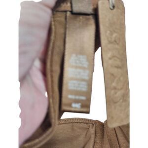 Very pretty and comfortable! Fabric is polymide and elastane. Demi cups have underwire, adjustable straps and hook and eye back closure. Size 44c, Chai color.
