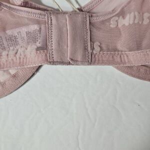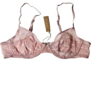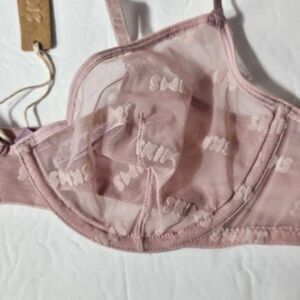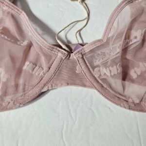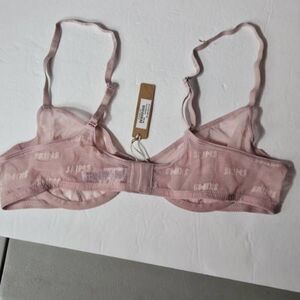 Very pretty and comfortable. Logo embossed all over. Underwire cups, adjustable straps and hook and eye back closure.