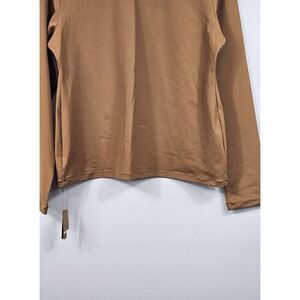 Almond color, size 2x. Beautiful heavyweight fabric is 74% nylon, 26% spandex. Silky soft and comfortable! Crewneck, long sleeved pullover.