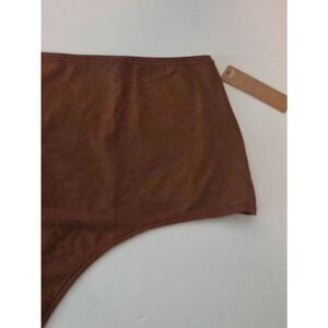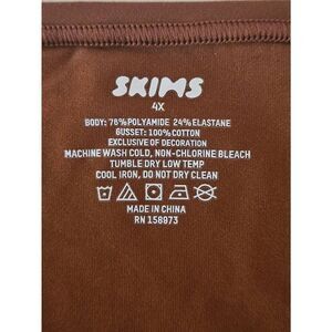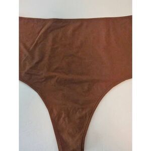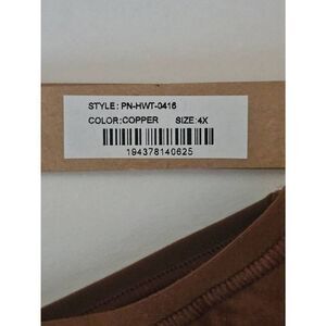 Copper color, size 4x. Pretty mid rise panty with thong back. Soft and comfortable. Fabric is 76% polymide, 24% elastane. Cotton lined gusset.