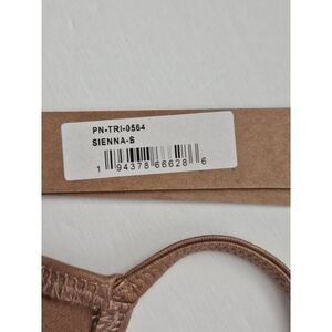 Sienna color,  size small.  Pretty and comfortable.   Triangle cups, string sides back and straps.