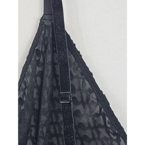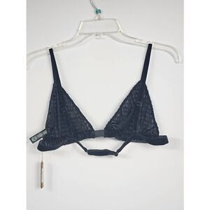 Soot color, size 2x. Sexy triangle cups, separated by elastic band, fully adjustable straps and adjustable back. Fabric is 48% nylon, 39% polyester, 13% spandex. Has raised logo all over.