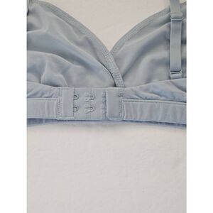 Sky color, size medium. Pretty crossover triangle cups, adjustable straps and double hook and eye back closure. Mesh lined cups. Fabric is 76% polymide, 24% elastane. Very soft and comfortable!