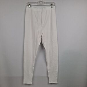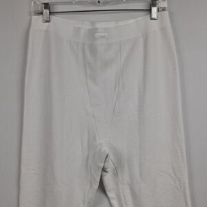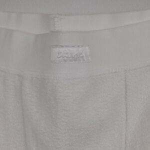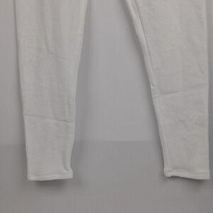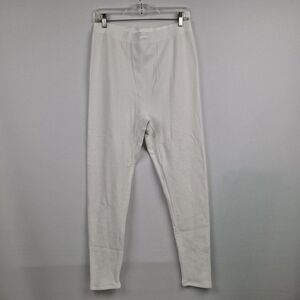 White, Size Xl. Elasticized waistband with boxer style front and skinny leg bottoms. Nice weight, soft fabric of 88% cotton, 10% polyester, 2% spandex. Measures 31" waist, inseam is 30".