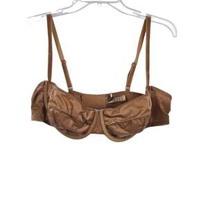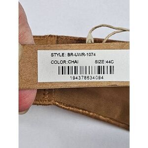 Chai is the color, size 45C. Pretty and comfortable. Fully adjustable straps, underwire cups and double hook and eye back closure. Fabric is 85% polymide, 15% elastane. There's a hint of shimmer to the fabric and straps are velvety.