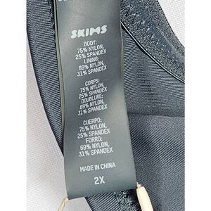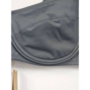 Gunmetal color,  size 2x.  Pretty and comfortable swim top is 75% nylon,  25% spandex.   Underwire cups, wide straps and silicone inside for grip