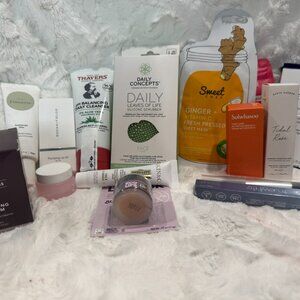 Contains several full-size and deluxe sample sized skin care products, including: