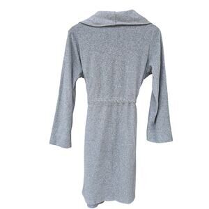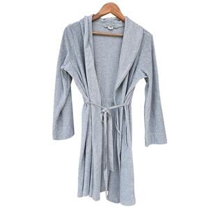Skin Micro French Terry Robe in Heather Grey. Size 1 (US S / Small). Features shawl collar, long sleeves, tie waist, side seam pockets, wrap front, and french terry fabric. 100% Organic Cotton. Excellent pre-owned condition, no flaws.