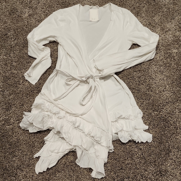 Luxurious white robe with ruffled hem. Ideal for relaxation and elegance.