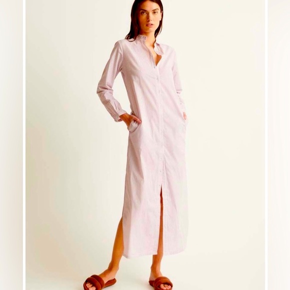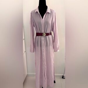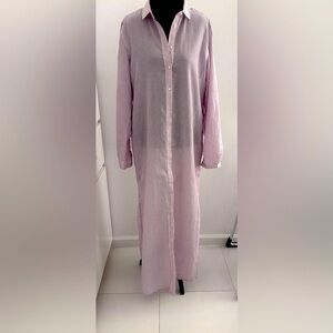 Elegant organic cotton striped maxi dress with long sleeves. And front pockets side slits Perfect for a chic look.