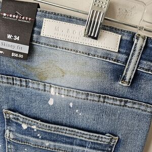 Stylish stretch distressed denim shorts in a light blue wash. Features unique paint splatter and ripped details.