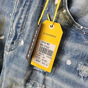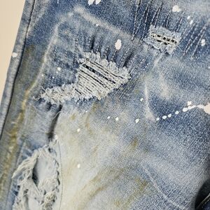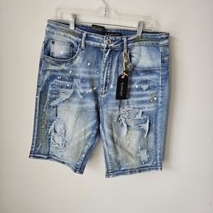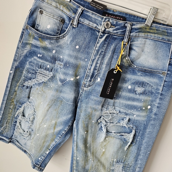 Stylish stretch distressed denim shorts in a light blue wash. Features unique paint splatter and ripped details.