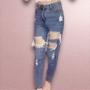 Size 1 Skinny Fries Denim mom jeans, distressed ripped jeans, high waisted, casual, streetwear, medium wash