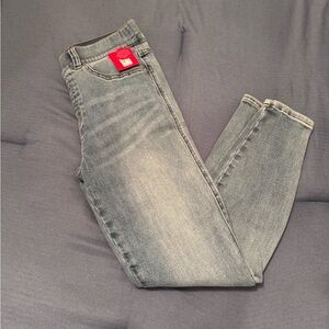 High-rise skinny jeans with stretch. Light faded wash and subtle whiskering. Classic five-pocket styling. Comfortable, figure-flattering fit. Easy to pair with casual tops.