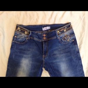 These jeans were designed in Italy. Decorative. New. Cotton/spandex blend. XL in Italy would fit like a 12 here.