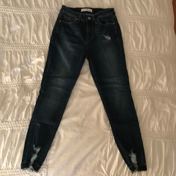 Dark and distressed skinny jeans. Frayed bottoms. Stretchy and comfy. Worn once.