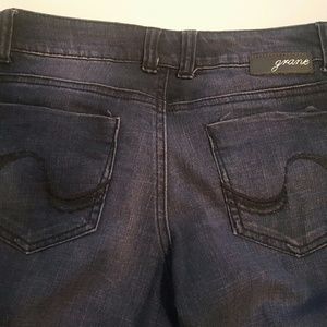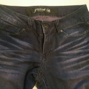 Purple tinted skinny jeans with great stretch, stipe whisker fading on front pockets, size 5