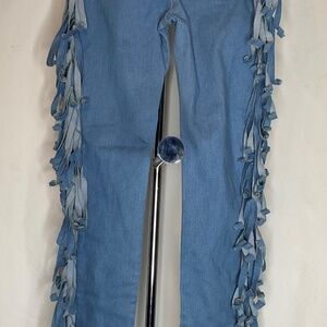 Make a bold fashion statement in these women’s skinny jeans with ruffle details running down each leg. Designed with premium stretch denim for a comfortable, body-hugging fit, these frill-trim jeans add a chic, feminine twist to your everyday style. Perfect for casual wear, date nights, or boutique fashion lovers looking for standout denim.