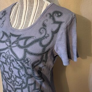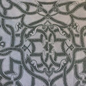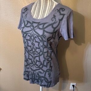The front of the shirt has a unique pattern in black, almost Victorian or medieval. Silver black beads embellish the entire pattern across the front. Very striking in person.
