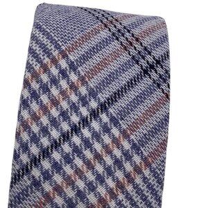 A contemporary men's skinny tie by Skinny Tie Madness in "The Blue Bird" plaid design. Durable and stylish with a pattern combining hues of blue, brown, and white.