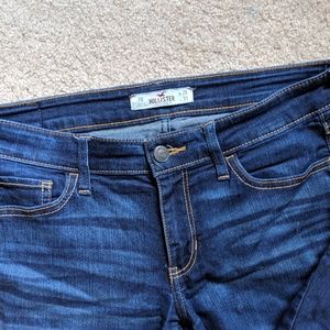 Dark wash skinny jeans from Hollister. Tapered ankle, pretty stretchy (82% cotton, 17% polyester). Gently used, only signs of wear are the broken tag on the back and some loose threads.