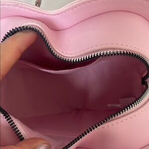 Charming heart-shaped bag featuring design. Perfect for adding a playful touch to your outfit. Comes in a delightful pink color.