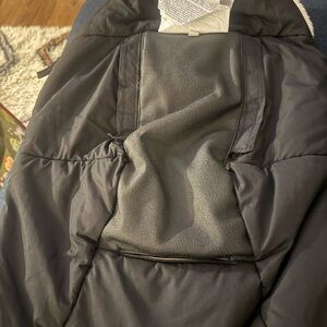 Warm black stroller cover with plush lining. Features secure buttons and a handy zipper pocket.