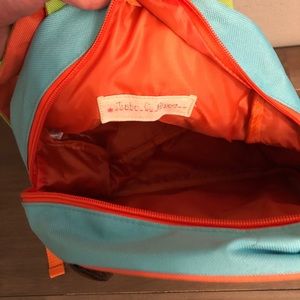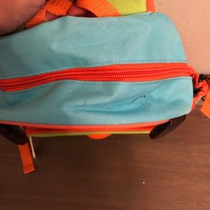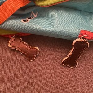 Dog backpack with front pocket and adjustable shoulder straps. Has a side pocket. Has a pen stain on top and some stains on bottom from normal wear. Also has my sons name written inside.