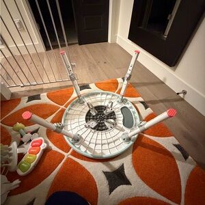 Engage your child with Skip Hop's activity center. Features interactive toys and a rotating seat. Bright colors stimulate play. Pretty great condition, we used it till stage 3. The only thing missing is yellow suction cup bowl. I wiped it, but we have pets, so please wipe again before using.