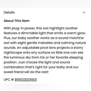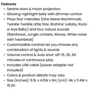 Owl-shaped nightlight with dimmable glow. Plays nature sounds and melodies. Includes star and moon projector.