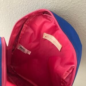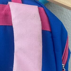Pink and blue bookbag with butterfly face and wings. Two zippered pockets, adjustable straps and water bottle pocket with bungee cord for snug fit. Sized for a toddler / preschooler.