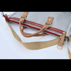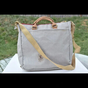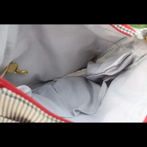 Mark on the back, discoloration near front pockets from where the tan color bled on the canvas (see pics)