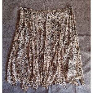 Embrace your wild side with the Sheri Martin animal print skirt, a statement piece that seamlessly transitions from business to casual wear. Its knee-length flare cut offers a flattering silhouette for plus-size figures, and the unique hankerchief hem adds a playful touch. With a mid-rise fit and convenient zip closure, this skirt promises both comfort and style.
