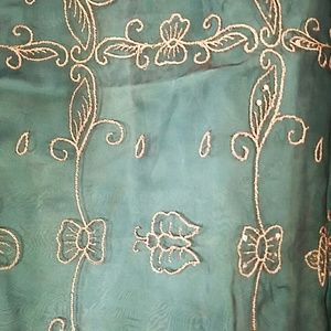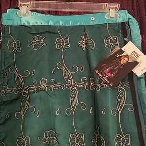 Long, chiffon/satin wrap around skirt with silver embroidery .Teal background. Brand new. Love the details!