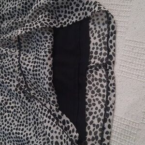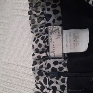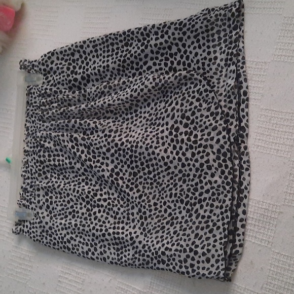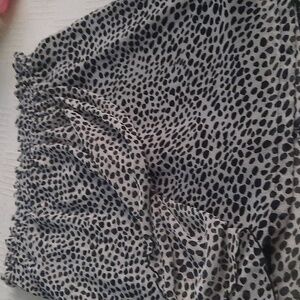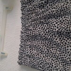 Classy leopard skirt draped detail front ruffle. Elastic waist band. 14 inches wide 18 inches length. Lined size PM 100% polyester great condition. Back zipper.