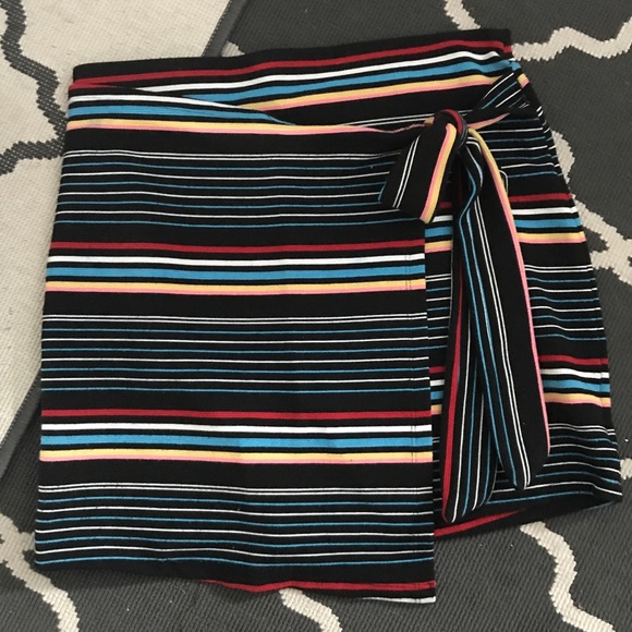 Colorful, striped, mini skirt with adjustable side wrap. Size 6 but runs like a 4. It has comfortable stretch.