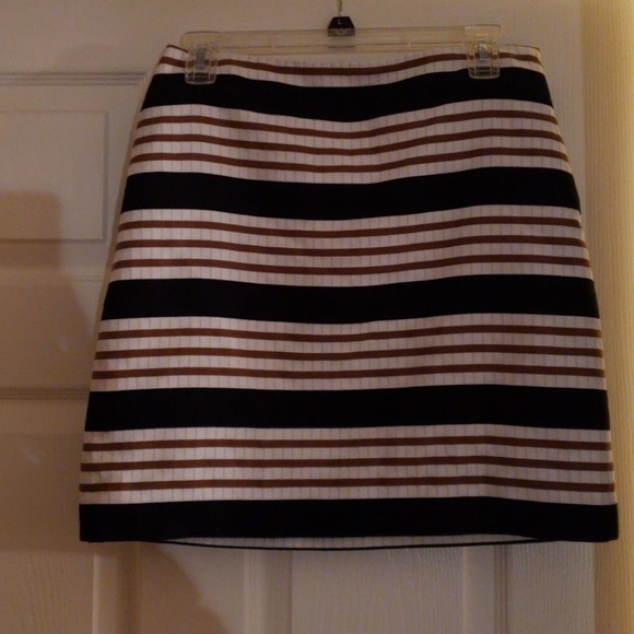 Black, tan and white striped skirt. Perfect for the office or a night out! Mini style, but office appropriate.