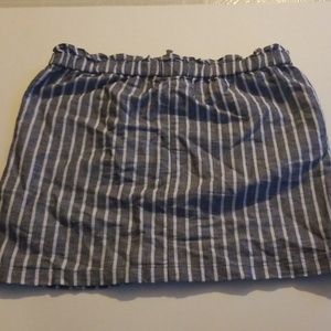 Grey skirt with white vertical lines. Also the waist band of the skirt stretches. The skirt has pockets as well