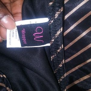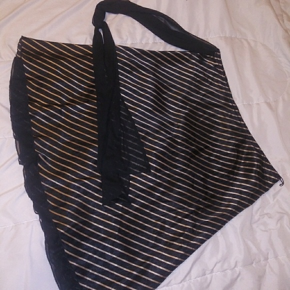 Gold and black striped skirt very soft and smooth material has a black satin **like** material as a wrap around tie and under the main gold and black material. Is around knee length on me (I'm 5'5)