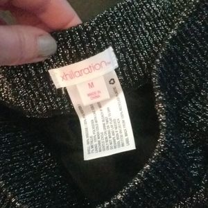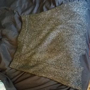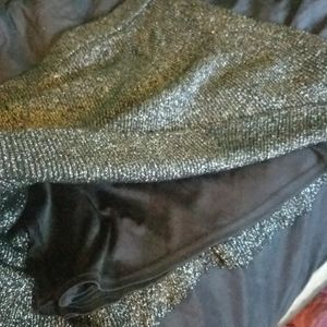 Very shiny silver skirt. Stretchy band at top, lots of give. Has a black slip underneath. Great for a nice occasion and in the winter on top of tights.