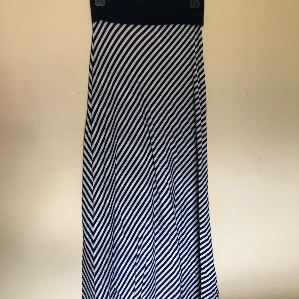 Navy blue and white stripes. Maxi, comfortable, and lightly worn.