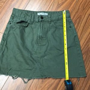 Olive green mini skirt. 15 inches long see photo. Had a rough salvage lower hem and functional pockets. Soft washed denim fabric. A wonderful summer basic.