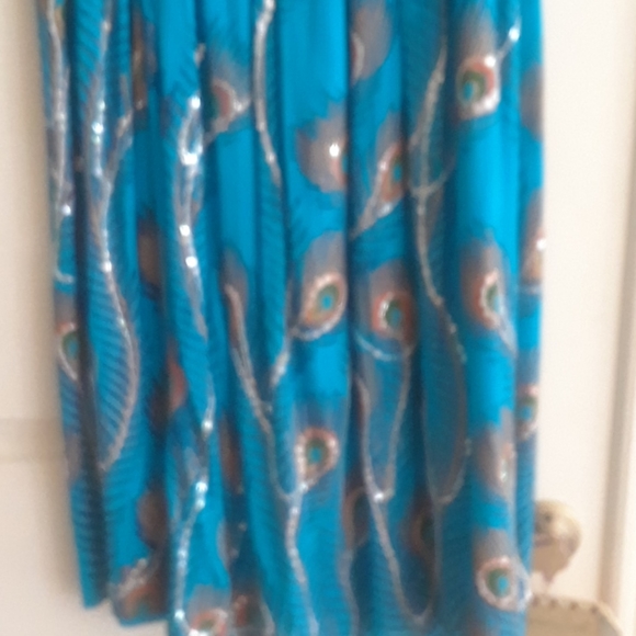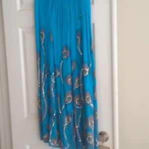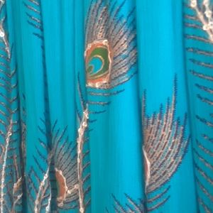 Crepe material skirt embroidered with peacock feathers & sequins . Elastic waist and cord to adjust. Royal peacock blue color